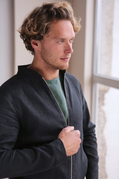 Men's linen bomber jacket. Color in the picture – Black. This trench is made from 100% Linen and is available