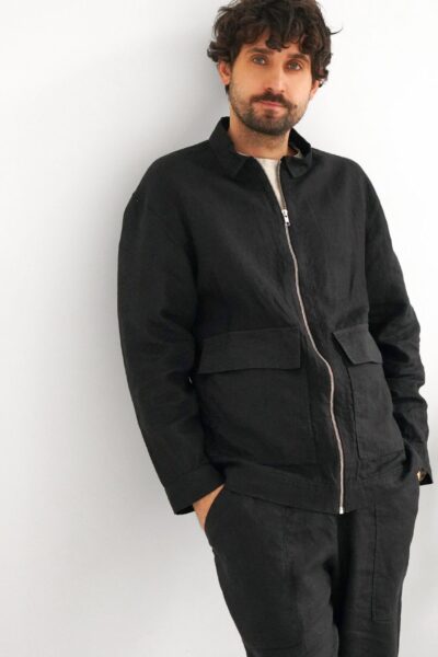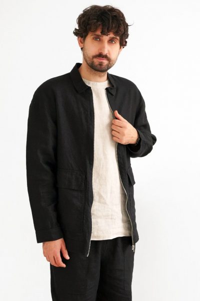 Men's linen bomber jacket with patch pockets. Color in the picture – Black. This jacket is made from 100% Linen