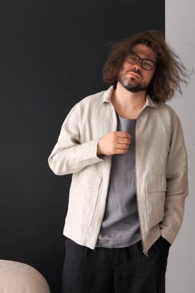 Men's linen bomber jacket with patch pockets. Color in the picture – Beige. This jacket is made from 100% Linen