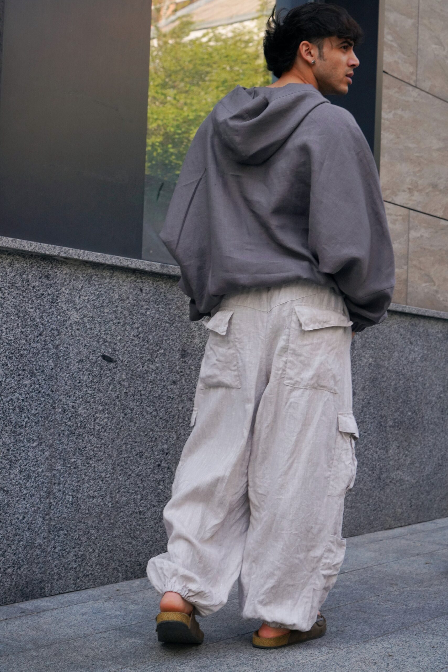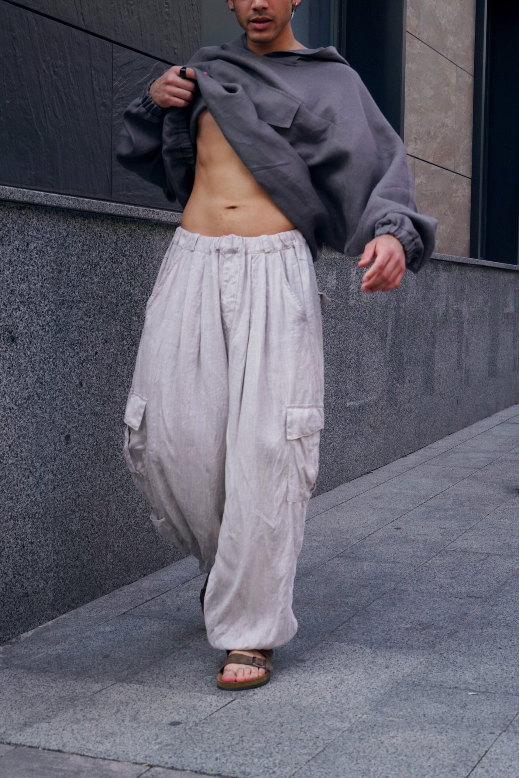 Drawstring Linen Pants Ivory Tone Linen for Men Casual Silhouette