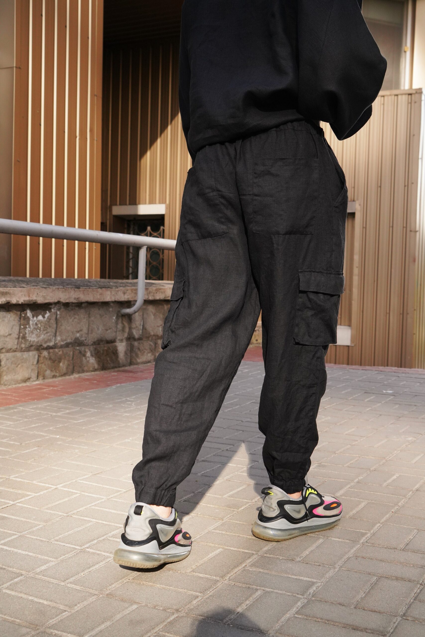 Loose-fit cargo pants are made from 100% Linen and available in a variety of colors.
