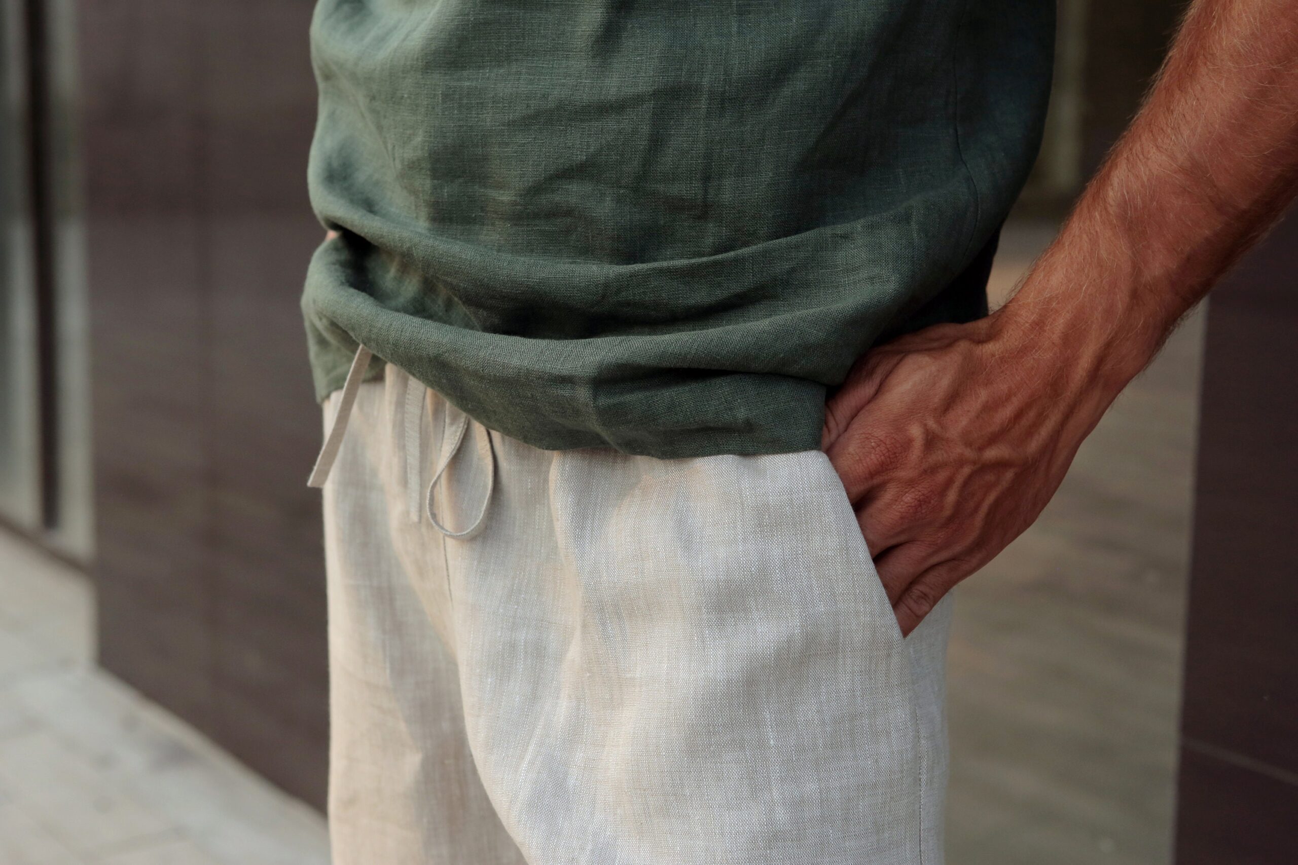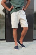 Loose-fit men's shorts are made from 100% Linen and available in a variety of colors.