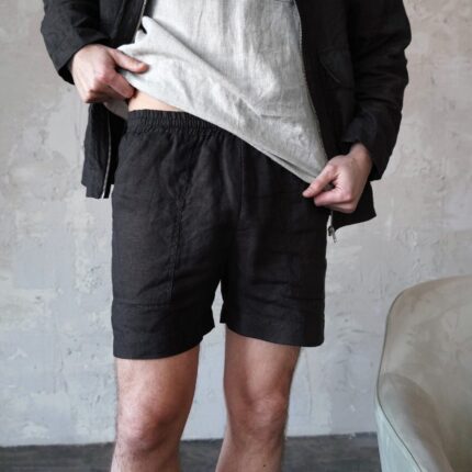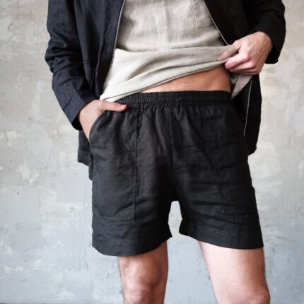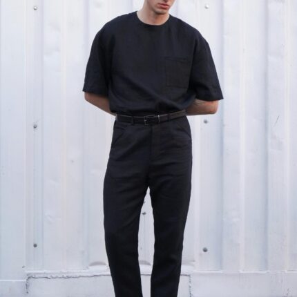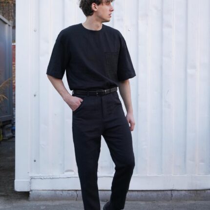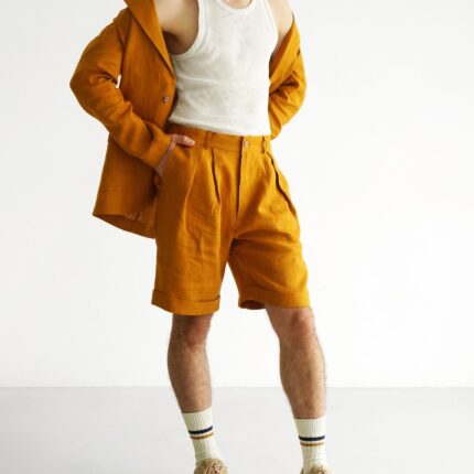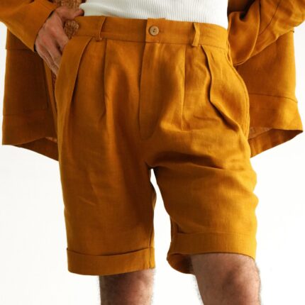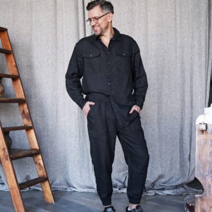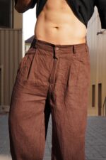 Wide men's linen joggers with pleats and zip. High-waisted pants.