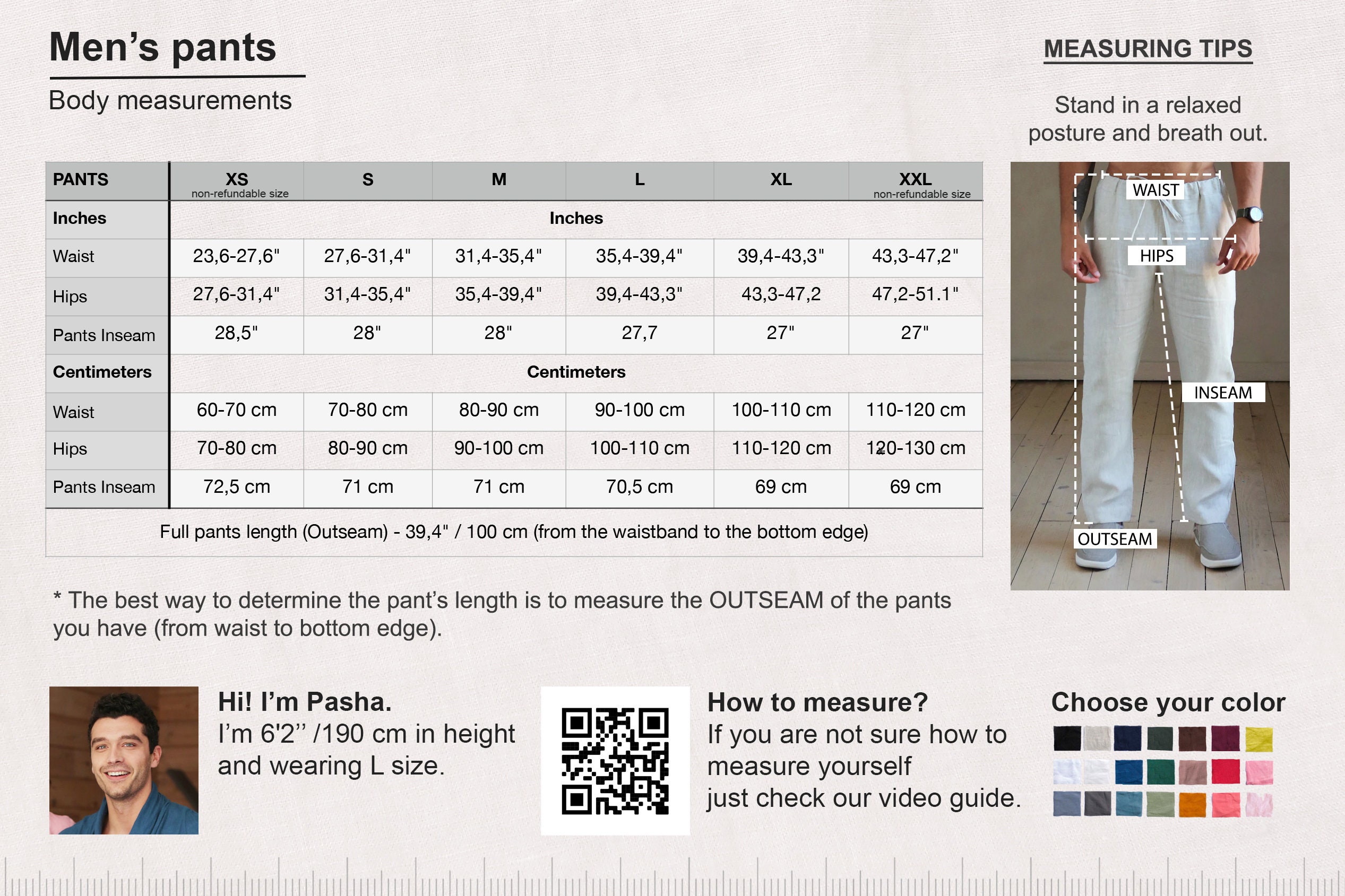 These pants are versatile, they are cozy and comfortable outdoors as well as at home. The fabric is breathable and takes the body shape, over time it becomes softer and more pleasant.